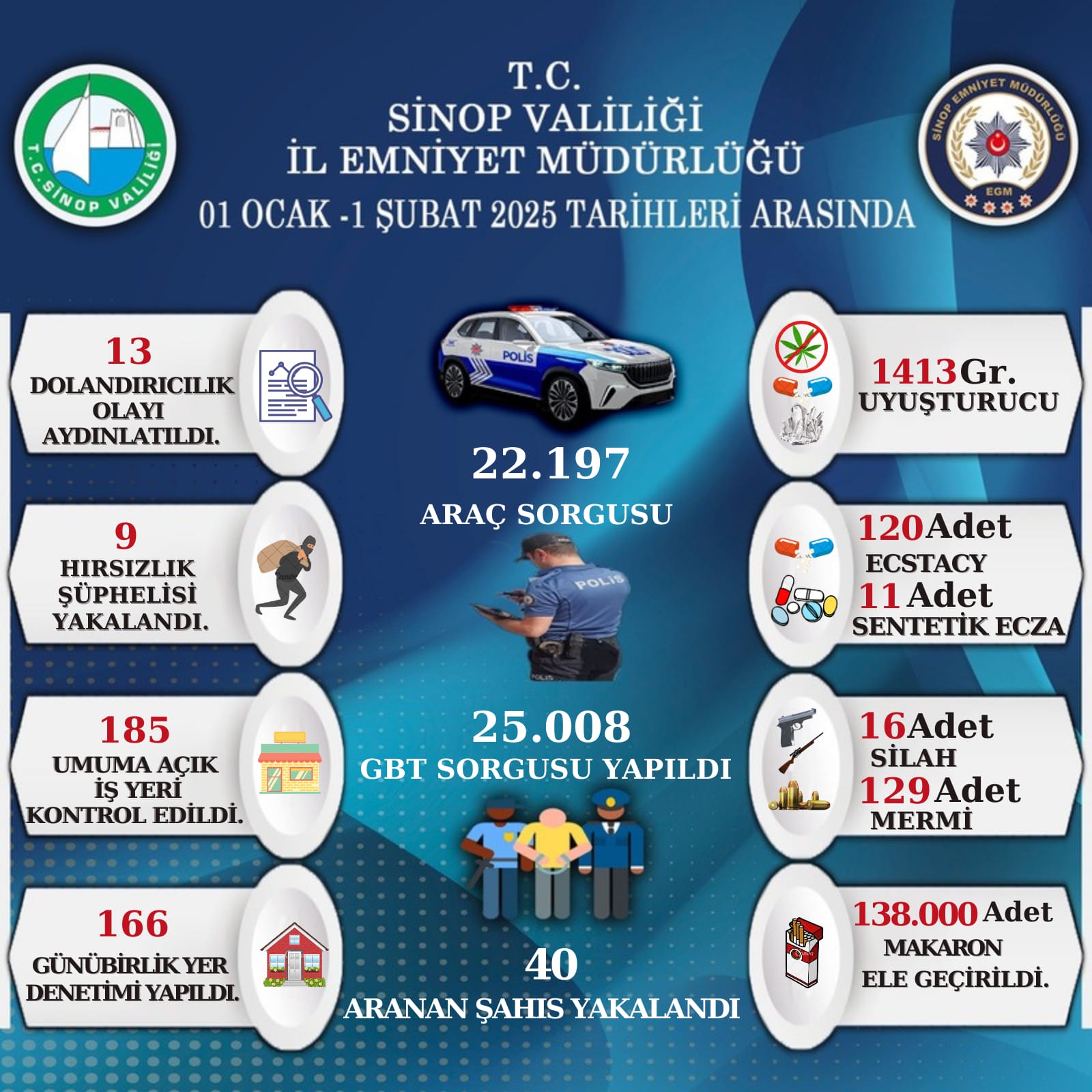 Sinop Valiliği'nce açıklanan raporda, İl Emniyet Müdürlüğü personeli tarafından 01 Ocak-01 Şubat tarihleri arasında Sinop'ta genel güvenlik ve asayişin temini açısından uygulanan tedbirler kapsamında yapılan şok uygulamalar neticesinde, 2.197 araç sorgusu, 25.008 GBT sorgusu yapıldı. 40 aranan şahıs yakalandı. 13 dolandırıcılık olayı aydınlatıldı. 9 hırsızlık şüphelisi yakalandı. 185 umuma açık iş yeri kontrol edildi. 166 günübirlik yer denetimi yapıldı. 1413 gram uyuşturucu, 120 adet Ectasy, 11 adet sentetik ecza maddesi, 138.000 adet makaron, 16 adet silah, 129 adet mermi ele geçirildi.