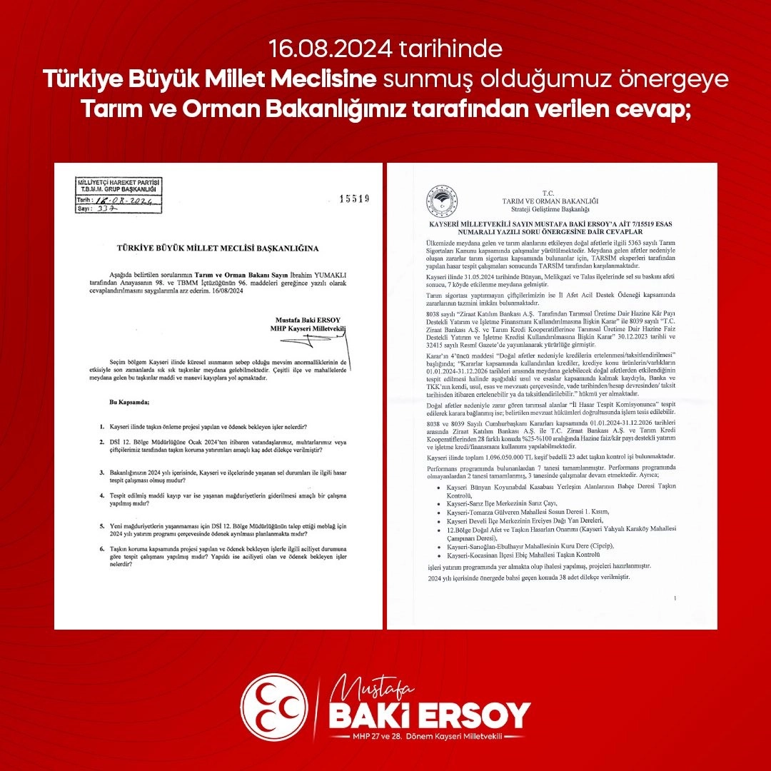Milliyetçi Hareket Partisi (MHP) Kayseri Milletvekili Baki Ersoy'un Tarım ve Orman Bakanlığı'na 27 Ağustos tarihinde gönderdiği önergesine bakanlıktan cevap geldi.