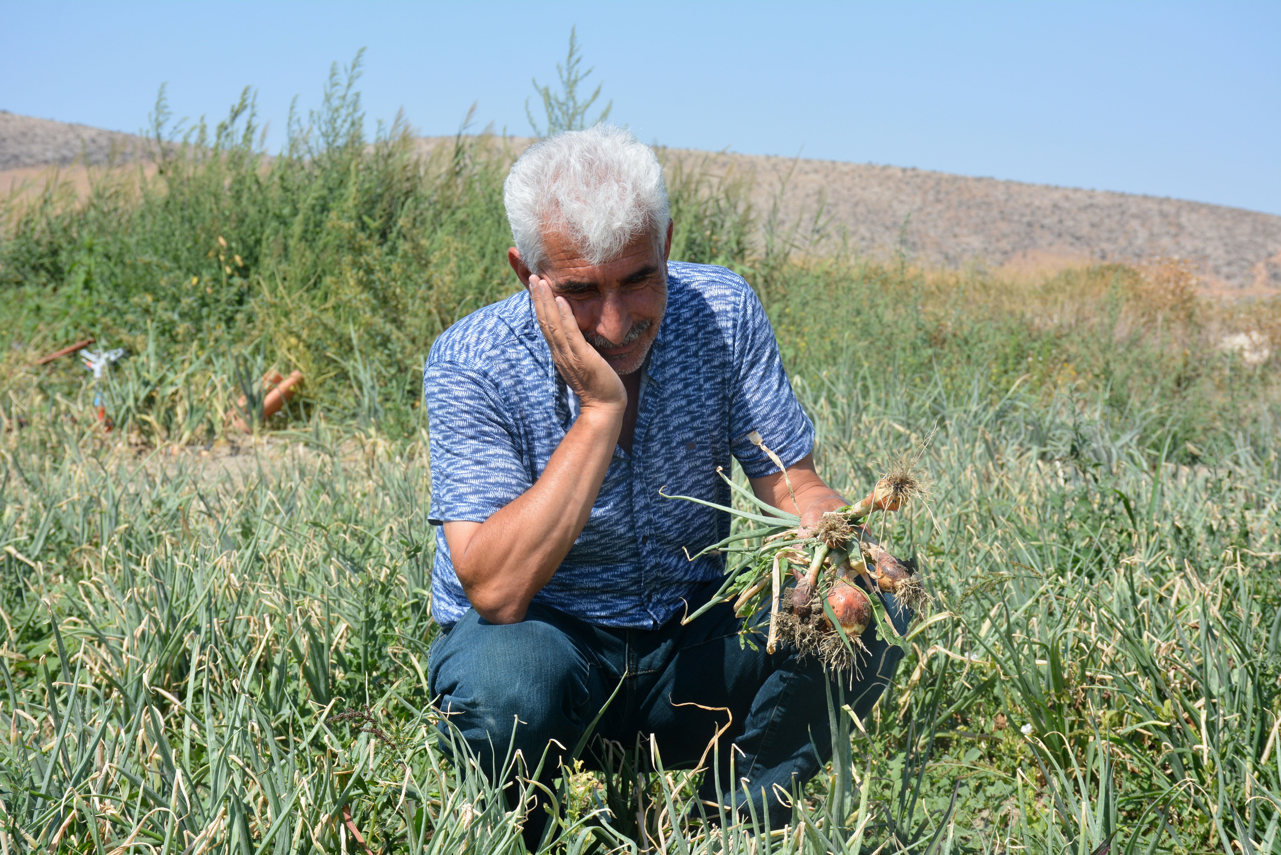 Yürekli, “Soğanın bir kellesi en az yarım kilo olması gerekirken şu an 100 ila 200 gram. Bu çiftçinin maliyetini de kurtarmaz. Çok büyük zarar eder. Rekolte düşük, gördüğünüz yerde soğanlar hep yanmış. Denizi de döksen soğanlar olmaz artık. Yüzde 70 ila 80 böyle” diye konuştu.