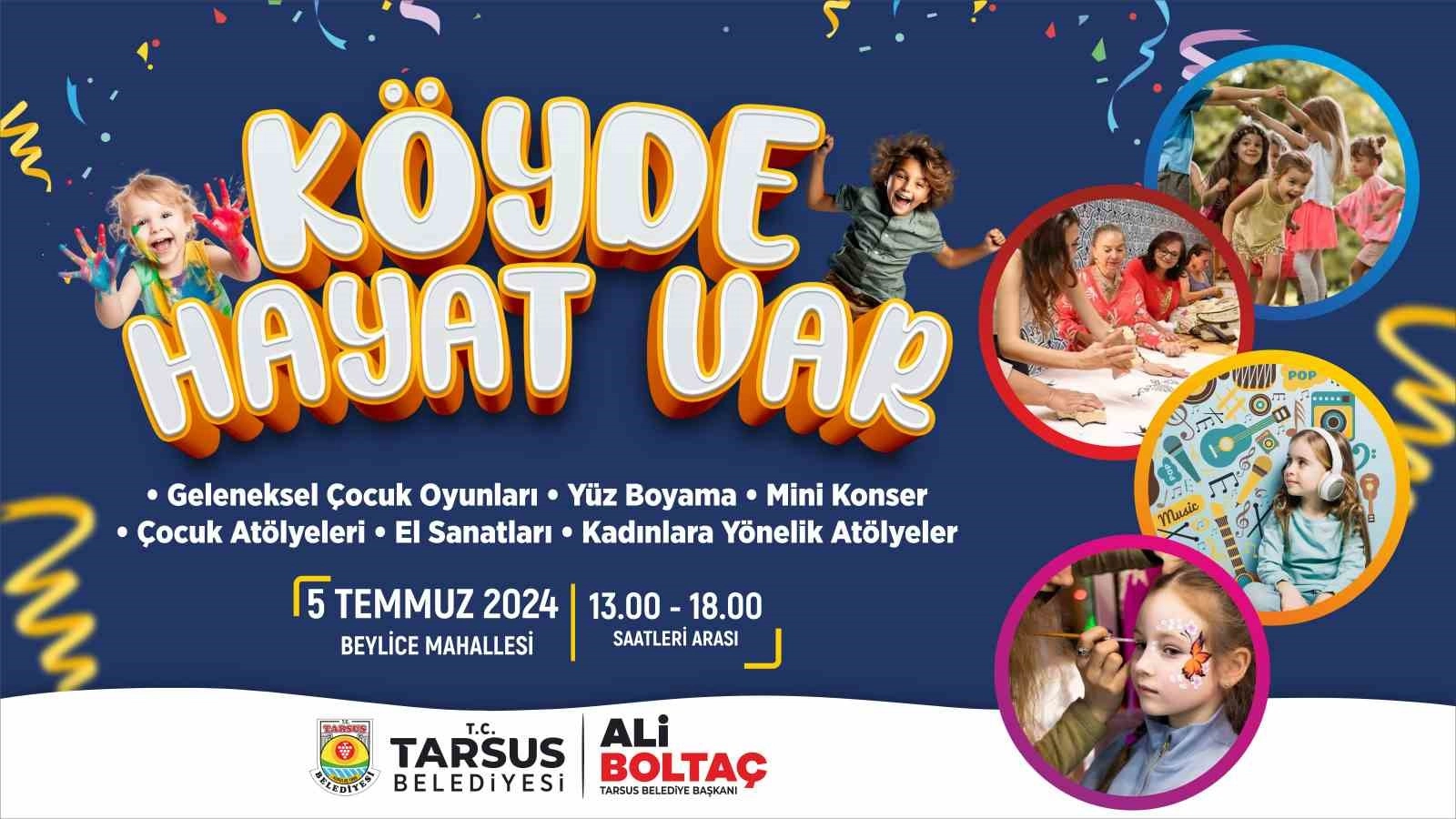 Tarsus Belediyesi Kültür ve Sosyal İşler Müdürlüğü ile Kadın ve Aile Hizmetleri Müdürlüğü koordinesinde, kırsal mahallelerde çocukların keyifli vakit geçirmesi amacıyla 'Köyde hayat var' şenlikleri düzenlenecek. Yaz tatilinde çocukları mutlu edecek rengarenk içeriklerle dolu olan şenlikler, geleneksel çocuk oyunları, yüz boyama, mini konser, çocuk atölyeleri, el sanatları ve kadınlara yönelik atölyeler gibi çeşitli etkinlikleri içeriyor. Etkinlikte hem çocuklar hem de aileler keyifli vakit geçirecek.