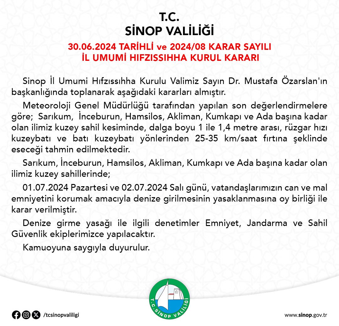 Sinop Valiliği’nden konu ile ilgili yapılan açıklamada, Meteoroloji Genel Müdürlüğünce yapılan son değerlendirmelere göre, ilimizin Sarıkum, İnceburun, Hamsilos, Akliman, Kumkapı ve Adabaşı'na kadar olan kuzey kesimlerinde dalga yüksekliğinin 1-1,4 metre olacağı, rüzgarın ise batı ve kuzeybatı yönlerinden saatte 25-35 kilometre hızla eseceği tahmin edilmektedir. Buna göre ilimizin Sarıkum, İnceburun, Hamsilos, Akliman, Kumkapı ve Adabaşı'na kadar olan kuzey sahillerinde vatandaşlarımızın can ve mal emniyetini korumak amacıyla 1 ve 2 Temmuz tarihlerinde denize girilmesi yasaklanmıştır.” İfadelerine yer verildi.