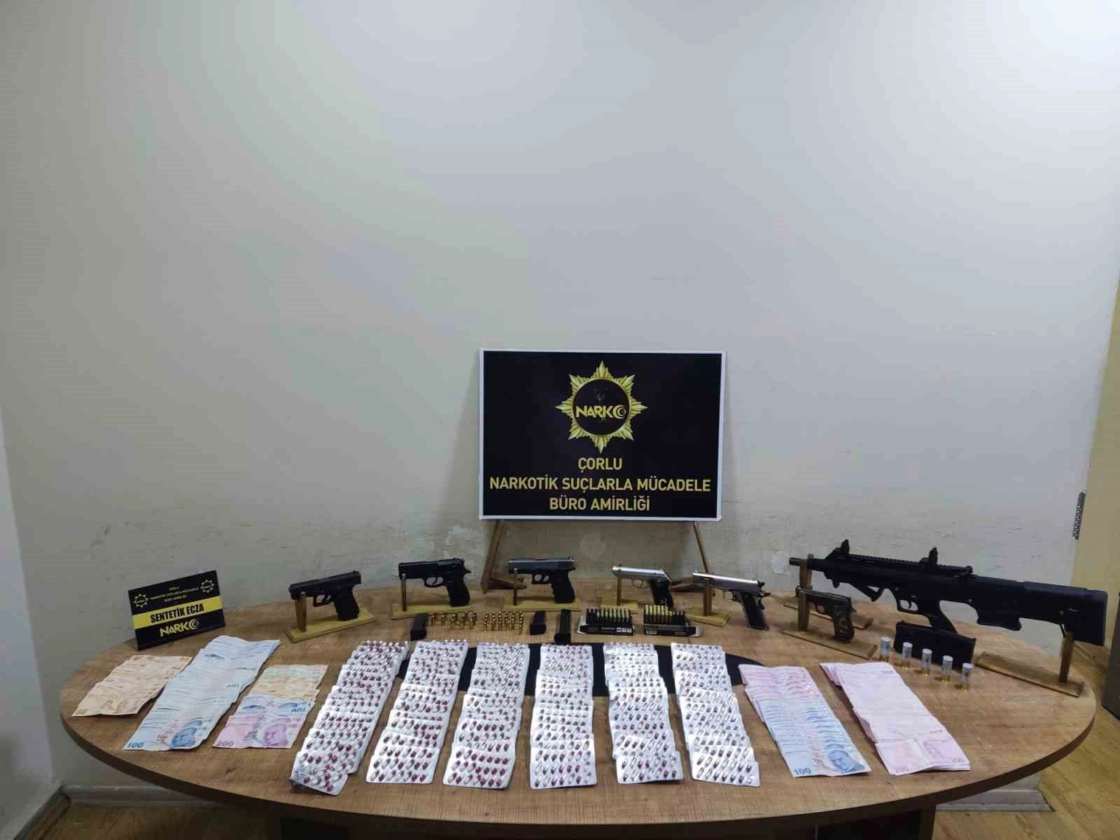 Tekirdağ İl Emniyet Müdürlüğü sorumluluk bölgesindeki suç olaylarını önlemeye devam ediyor. Ekiplerce yapılan 3 günlük çalışmalarda 14 adet ruhsatsız tabanca, 2 av tüfeği, 3 kuru sıkı tabanca,4 bin 416 adet extacy-sentetik ecza, 384,8 gr bonzai, 122 gram eroin, 19,4 gr esrar - skunk, 12,1 gram metamfetamin, 12 bin 361 şişe alkollü sahte içki, 57 kilogram kıyılmış tütün, suçtan elde edildiği değerlendirilen 51 bin 580 TL ele geçirildi.