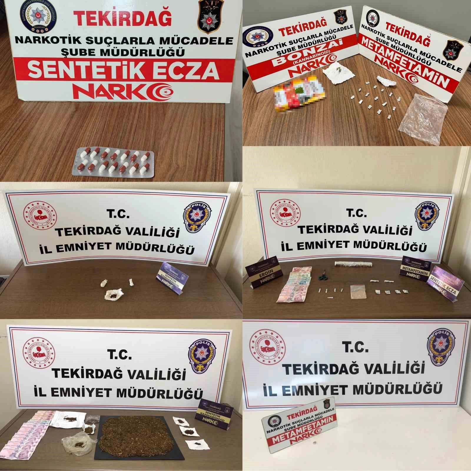 Tekirdağ İl Emniyet Müdürlüğü Narkotik Suçlarla Mücadele Şube Müdürlüğü ekiplerince, 5-8 Ekim 2024 tarihleri arasında Süleymanpaşa, Çerkezköy ve Çorlu ilçelerinde gerçekleştirilen operasyonlarda, uyuşturucu madde bulundurdukları tespit edilen 11 şahıs üzerinde ve 3 farklı ikamette aramalar yapıldı. Aramalarda çeşitli uyuşturucu maddeler ve uyuşturucu ticaretinden elde edildiği değerlendirilen para ele geçirildi.