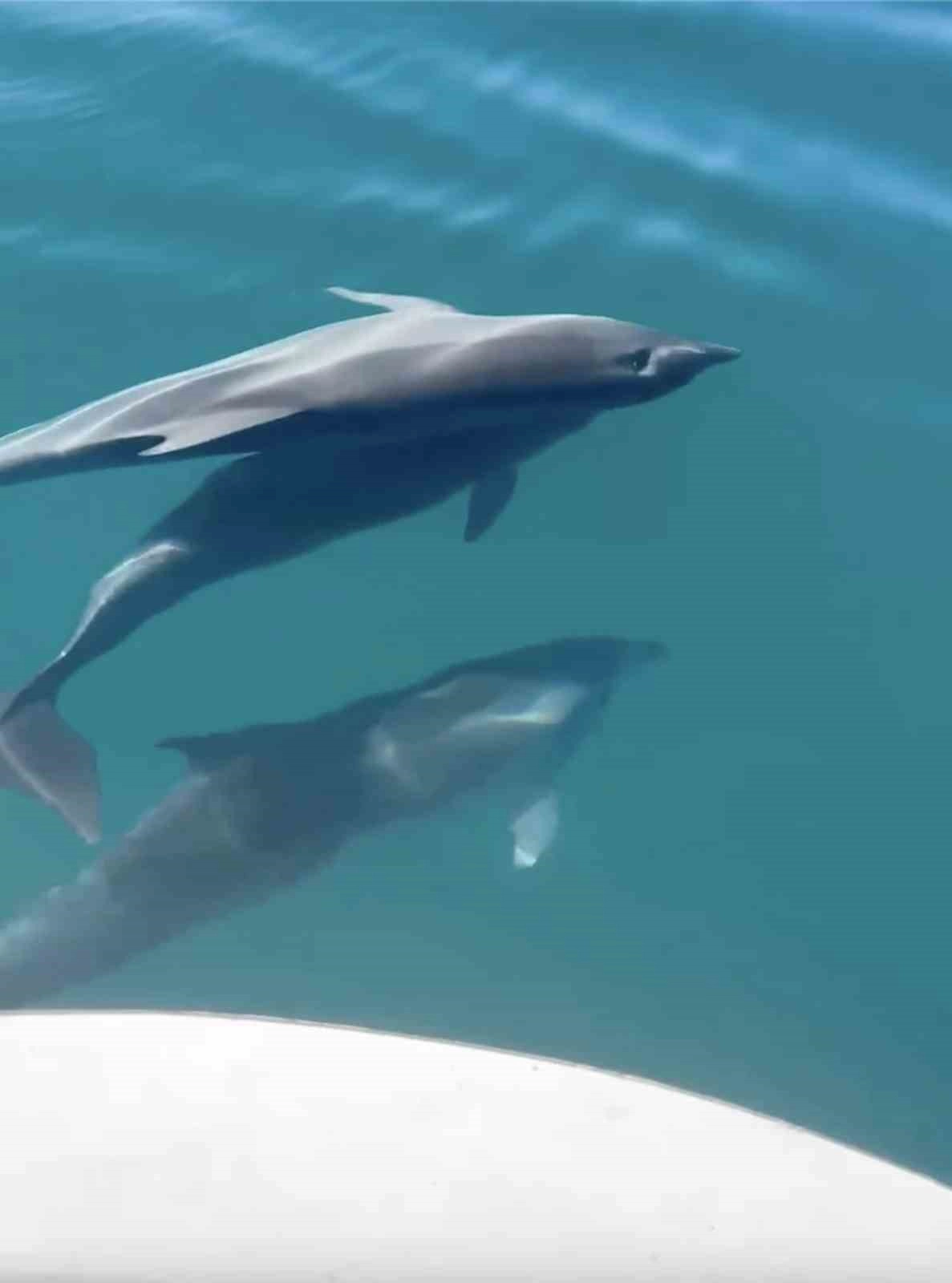 Balıkçılar, tekne ile yarılan yunusların gösterisini cep telefonları ile görüntüledi. Sosyal medyada paylaşılan görüntüler büyük ilgi gördü.