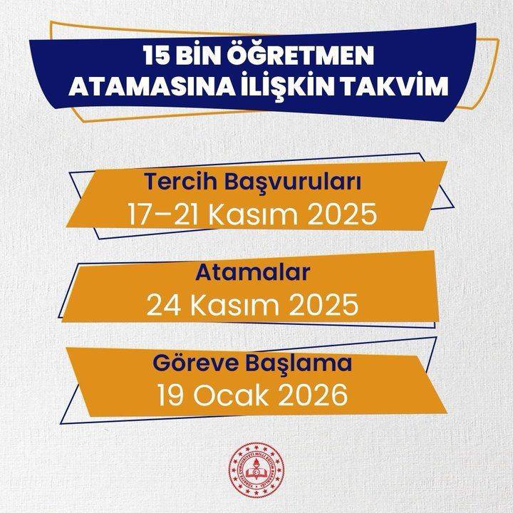 Kılavuza göre, öğretmen adaylarının tercih başvuruları 17 - 21 Kasım 2025 tarihleri arasında alınacak. Başvuruların ardından atama işlemleri 24 Kasım 2025 tarihinde gerçekleştirilecek.