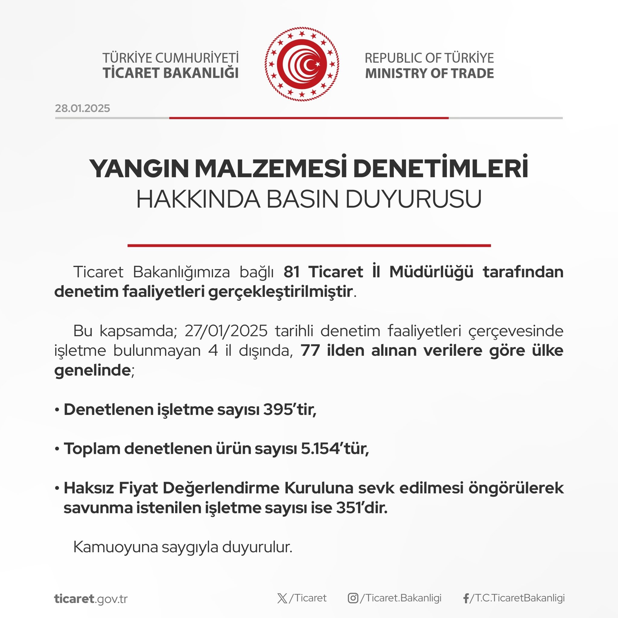 Ticaret Bakanlığı, 81 ilde gerçekleştirilen yangın malzemesi denetimleri çerçevesinde 395 denetlenen işletmenin 351’inden savunma istendiğini duyurdu.