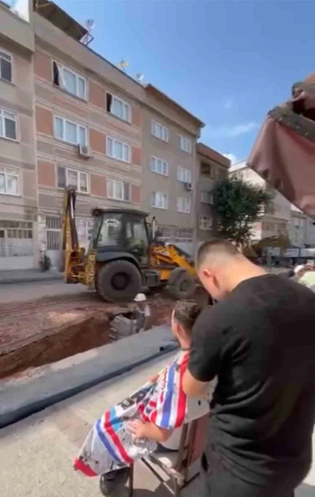 Bursa'da berberini ikna eden vatandaş, kaldırım üzerinde tıraş olurken yol yapım çalışmasını izledi.