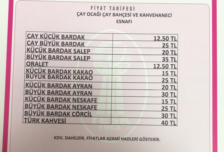 Sinop Esnaf ve Sanatkarlar Odaları Başkanlığı Yönetim Kurulu kararı ile il merkezindeki çay ocakları, çay bahçeleri ve kahvehanelerdeki içeceklere zam yapıldı. Son güncellenen fiyat listesine göre 7,5 TL'den satılan 1 bardak çay 12,5 TL'ye çıktı. Uygulanmaya başlanan yeni tarife ile birlikte Sinop'ta işletmelerde çay 12,5 TL, büyük çay 25 TL, küçük bardak salep 20, büyük bardak salep 35 TL, küçük bardak kakao 15 TL, büyük bardak kakao 25 TL'den satışa sunulurken Türk kahvesi de 40 TL oldu.