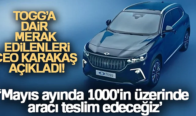 Togg CEO’su Gürcan Karakaş, “Kalitemizden ödün vermeden üretimlerimizi Mayıs ve Haziran ayında artıracağız. Mayıs ayında 1000’in üzerinde teslimat yapmayı planlıyoruz” dedi.