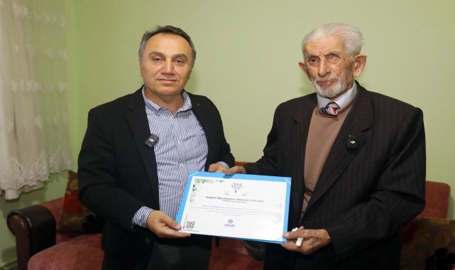 Yılmaz, ilkokul öğretmeni Abdullah Çamlıbel adına rektörlük tarafından dikilen ağacın belgesini öğretmenine takdim etti.