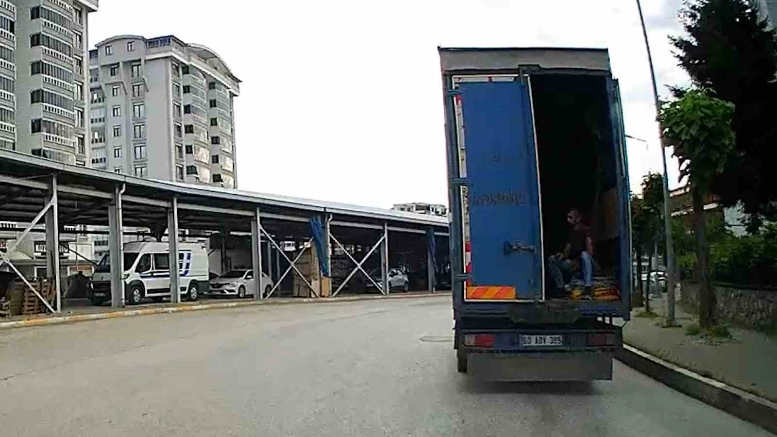 Olay sabah saatlerinde kentteki Behzat Balvarı'nda yaşandı. Seyir halindeki bir nakliye kamyonunun arka kapağı açık halde trafikte ilerlediği görüldü. Açık kapının önünde oturan şahsın rahat hareketleri dikkatlerden kaçmadı. O anlar araç kamerası tarafından kaydedildi. Trafikte bu şekilde ilerleyen kamyon daha sonra gözden kayboldu.