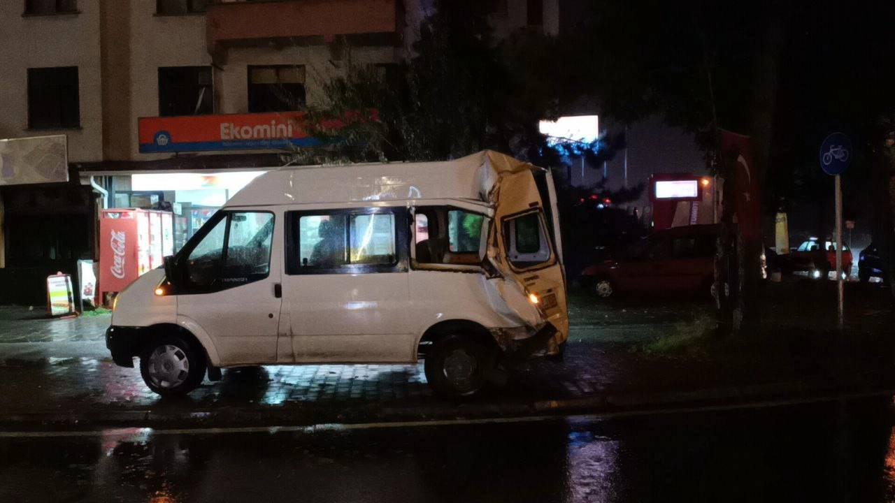 Bolu'da Sanayi Kavşağı'nda trafik ışıklarında yağış etkisiyle duramayan tır, önünde giden minibüse çarptı. Çarpmanın etkisiyle minibüsün arka kısmı kağıt gibi ezildi.