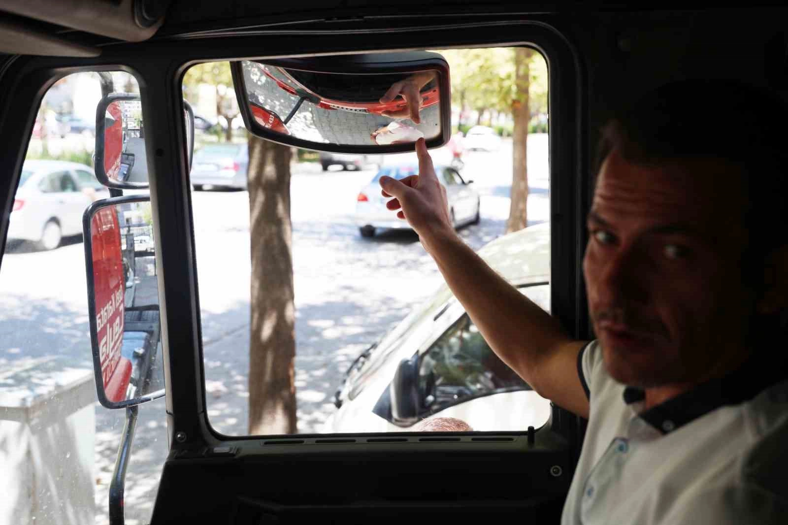 Büyük ve küçük araçlarda kör nokta denilen bir nokta olduğunu söyleyen İleri Sürüş Uzmanı Ramazan Ceylan, "Büyük araçlarda yüksek olduğu için biz aracın sağında, solunda veya önünde olan canlı veya cansız bazı cisimleri görme ihtimalimiz azalıyor. Her ne kadar aynamız olsa da ayna yüksekliği bizim boyumuzun üzerinde olduğu zaman veya yanımızdaki araçlardan yukarda olduğu için sağ aynadan sağımızdaki araçları göremiyoruz. Buna önlem olarak peron aynası dediğimiz sağ taraftaki kapının üzerinde bir aynamız var. Buna ilave olarak camın ön kısmında peron aynası dedikleri bir aynamız daha olur. Buralardan görebildiğimiz kadar görüyoruz" dedi.