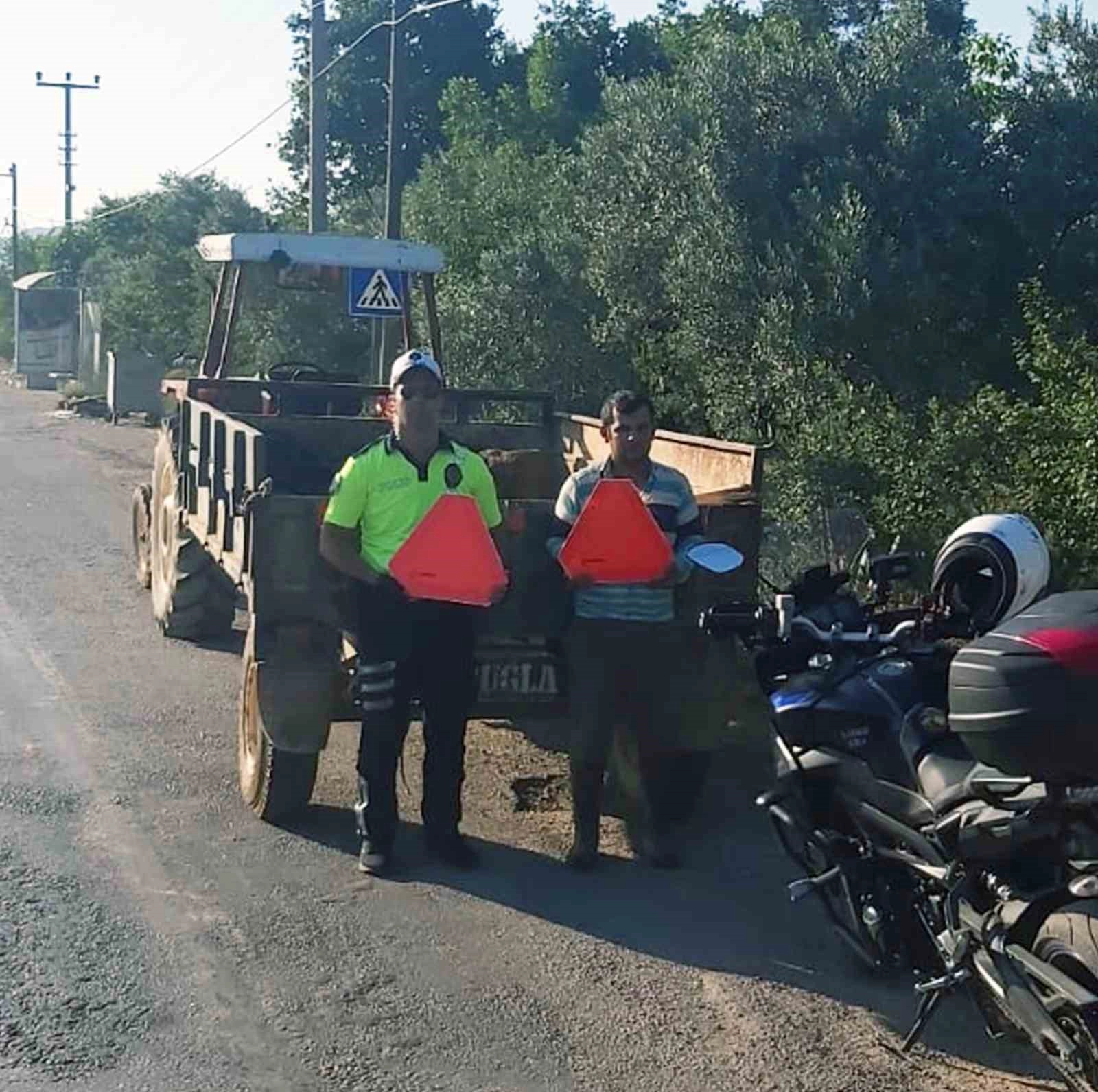 Tarımsal faaliyetlerin yoğun olarak yaşandığı bölgelerdeki yollarda seyreden traktörler için Muğla Emniyet Müdürlüğü Trafik Tescil ve Denetleme Şube Müdürlüğü ekipleri hem denetim yapıyor, hem de reflektörü olmayan traktörlerin römorklarına reflektör hediye ediyor.