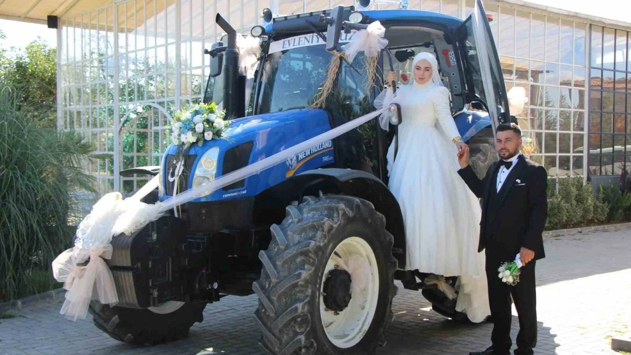 Çiftçi Büşra Yaman (21) ile kepçe operatörü Emrullah Satılmış (23) dillere desten düğünleri öncesi düğün arabası olarak traktörlerini kullanmaya karar verdi. Traktörü süsleyen çift, daha sonra ilçede traktörle dolaştı. Çiftin arkadaşları da konvoya katıldı. Gelinin direksiyon başına geçmesi ise renkli görüntülere sahne oldu.