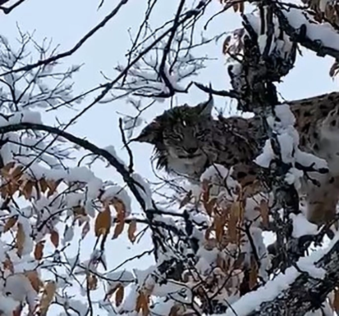Tunceli'de karlı ağaçta kamufle olan koruma altındaki vaşak görüntülendi.