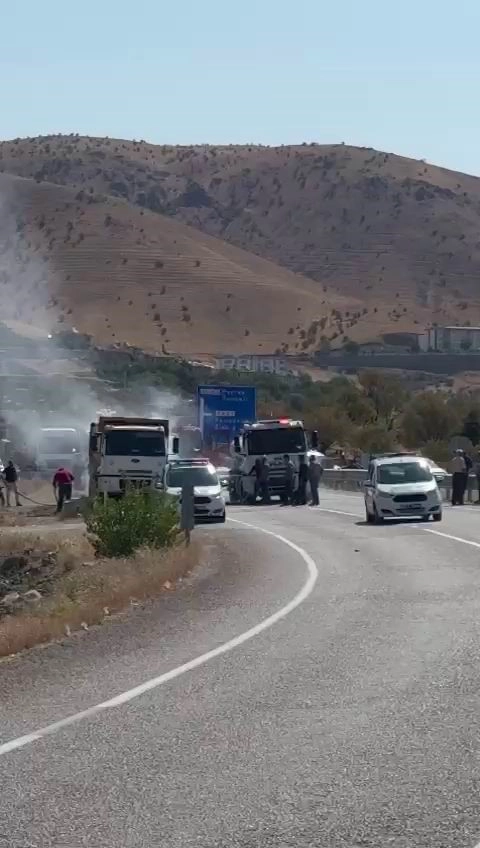 Olay sabah saatlerinde Pertek ilçe girişinde meydana geldi. Edinilen bilgilere göre plakası ve sürücüsü öğrenilemeyen kamyon, seyir halindeyken bir anda alev aldı. Haber verilmesi üzerine olay yerine sağlık, polis ve itfaiye ekipleri sevk edildi. Alevler, yapılan müdahalenin ardından kontrol altına alınarak söndürülürken, araçta maddi hasar meydana geldi. Yangın nedeni ile kapanan yol, bir süre sonra tekrar trafiğe açıldı.