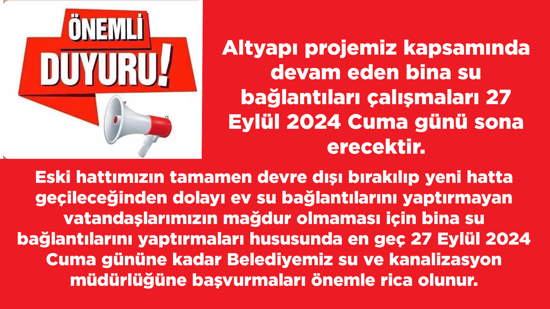 Belediye yetkilileri, eski su hattının devre dışı bırakılıp yeni hatta geçileceği için, su bağlantılarını yaptırmayan vatandaşların mağdur olmaması adına acil olarak başvuruda bulunmalarını istedi. Konu ile ilgili Türkeli Belediyesinden yapılan açıklamada, “Altyapı projemiz kapsamında devam eden bina su bağlantıları çalışmaları 27 Eylül 2024 Cuma günü sona erecektir. Eski hattımızın tamamen devre dışı bırakılıp yeni hatta geçileceğinden dolayı ev su bağlantılarını yaptırmayan vatandaşlarımızın mağdur olmaması için bina su bağlantılarını yaptırmaları hususunda en geç 27 Eylül 2024 Cuma gününe kadar Belediyemiz su ve kanalizasyon müdürlüğüne başvurmaları önemle rica olunur.” İfadelerinde bulunuldu.