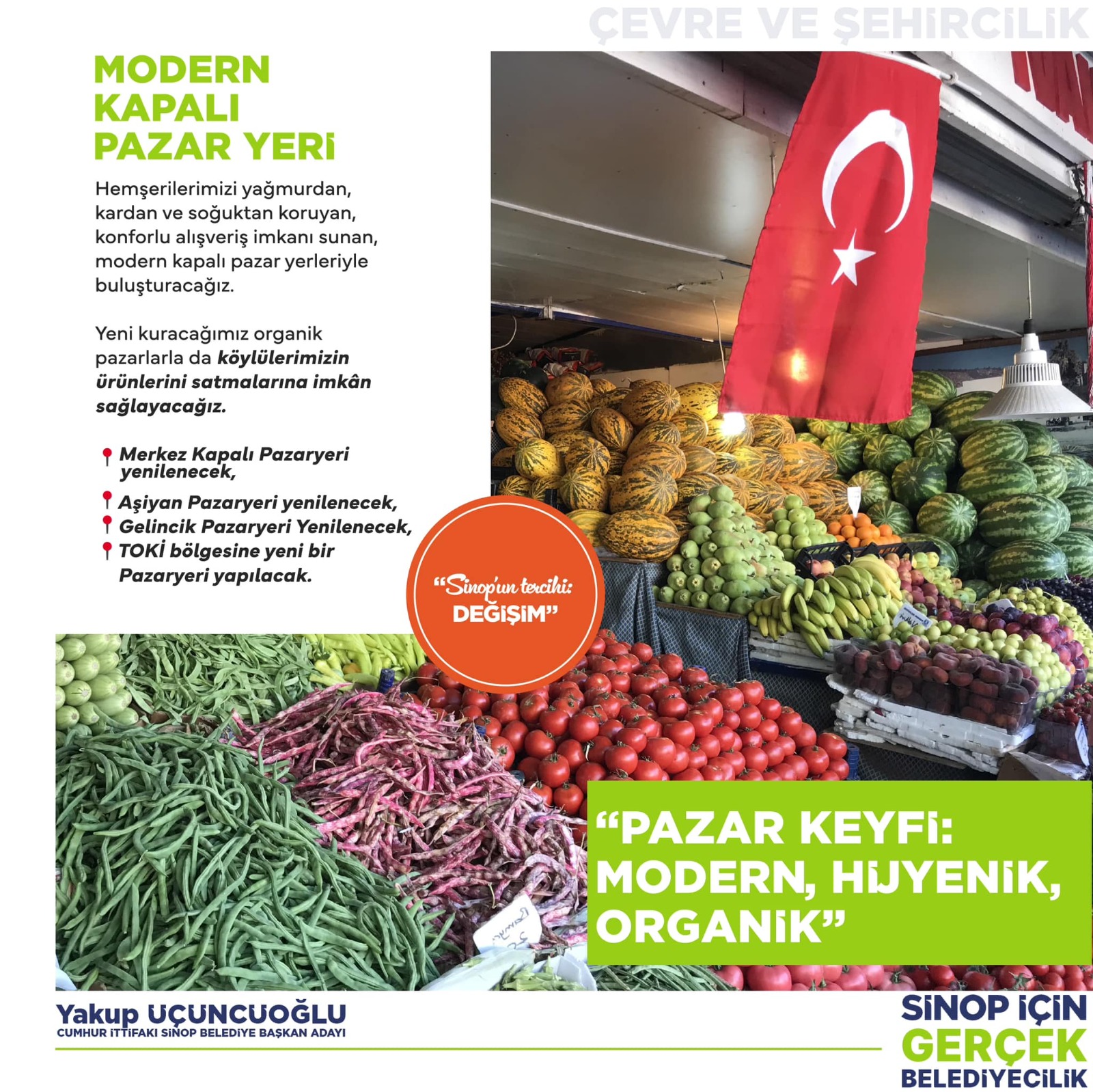 Belediye Başkan Adayı Üçüncüoğlu, sosyal medya hesabından yaptığı paylaşımda kapalı pazaryeri projesi hakkında bilgiler verdi. Vatandaşlara seslenen Üçüncüoğlu, “Hemşerilerimizi yağmurdan, kardan ve soğuktan koruyan, konforlu alışveriş imkanı sunan, modern kapalı pazar yerleriyle buluşturacağız. Yeni kuracağımız organik pazarlarla da köylülerimizin ürünlerini satmalarına imkan sağlayacağız” dedi.