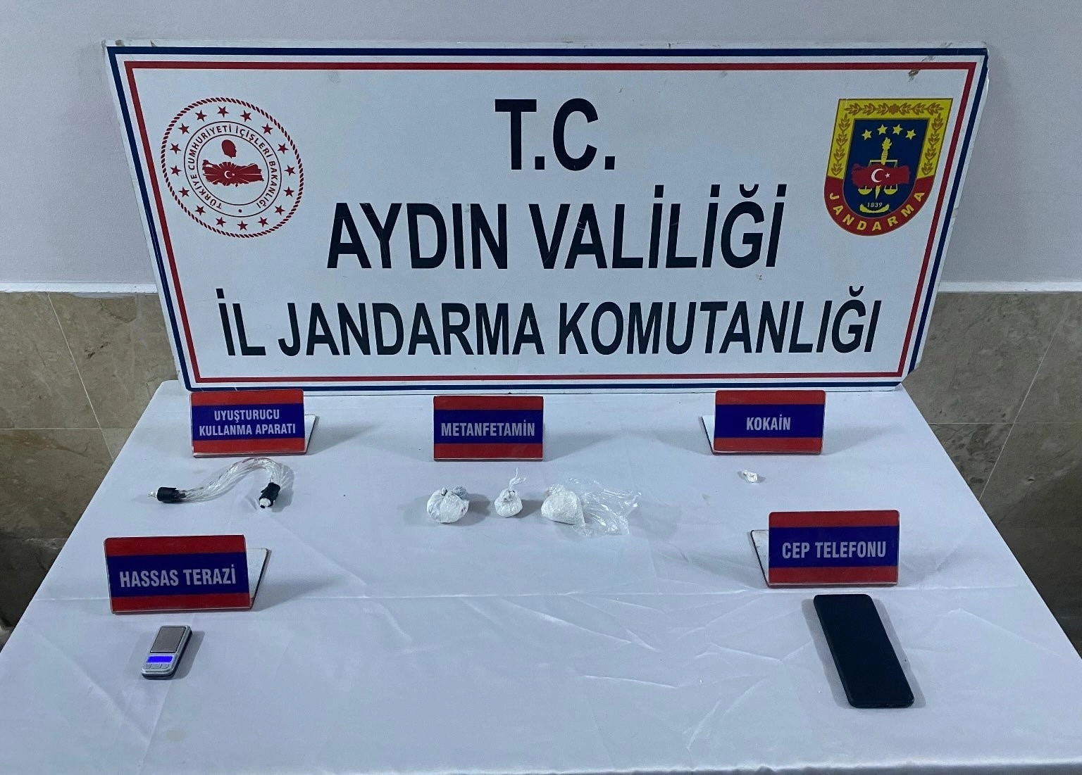 Aydın İl Jandarma Komutanlığı KOM Şube Müdürlüğü ve Nazilli Otoyol Jandarma ekiplerince uyuşturucu madde imal ve ticaretine yönelik icra edilen koordineli çalışma gerçekleşti. Edinilen bilgiye göre, Denizli-Aydın Otoyolu Kuyucak gişelerinde durdurulan bir takside yolcu olarak bulunan M.M. (32) isimli şüpheli şahsın üzerinde uyuşturucu madde bulundu. Şahsın üzerinde ve Nazilli ilçesinde bulunan ikametinde yapılan aramalarda 118 gram metamfetamin, bir miktar kokain, 1 adet hassas terazi, 1 uyuşturucu kullanma aparatı ele geçirildi. Yakalanarak gözaltına alınan şüpheli şahıs çıkarıldığı adli makamlarca tutuklanarak cezaevine gönderildi.