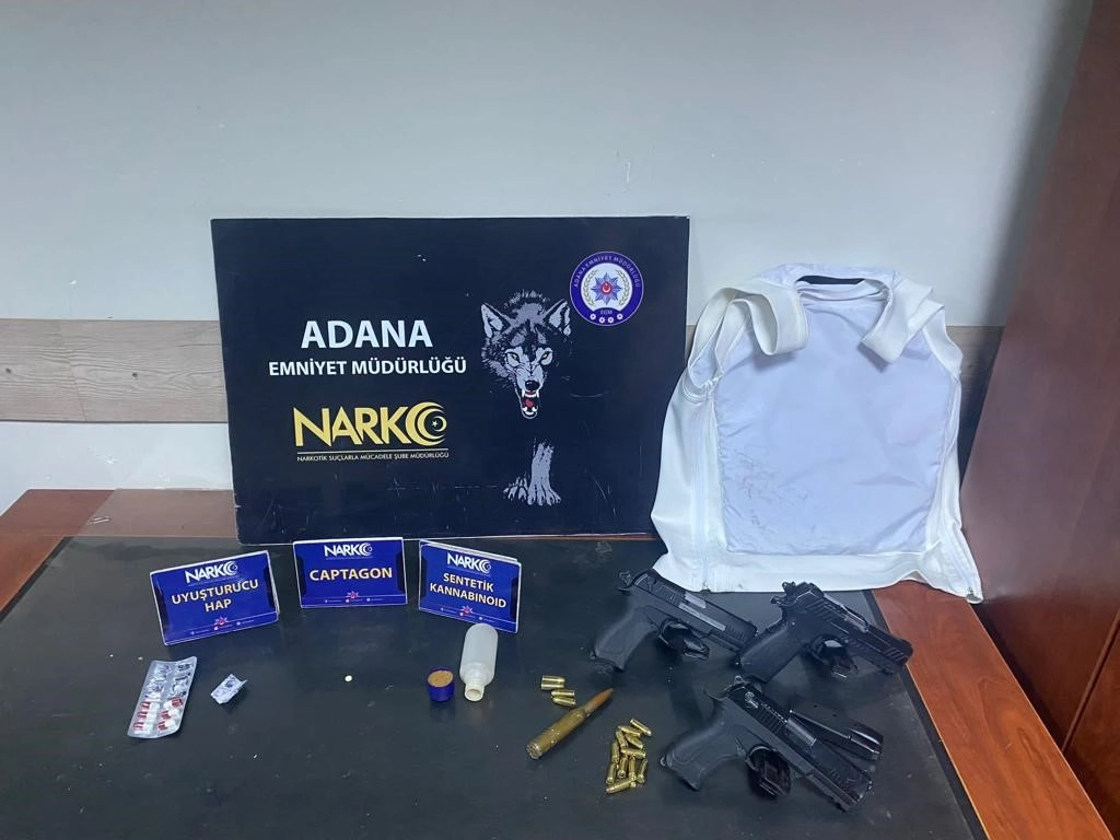 İkametlerde yapılan aramalarda 20,17 gram sentetik kannobinoid, reçeteyle satışı yapılan 7 uyuşturucu etkili hap, ruhsatsız 3 tabanca, bu silahlara ait 15 mermi, çelik yelek ile 1 uçaksavar mermisi ele geçirildi.