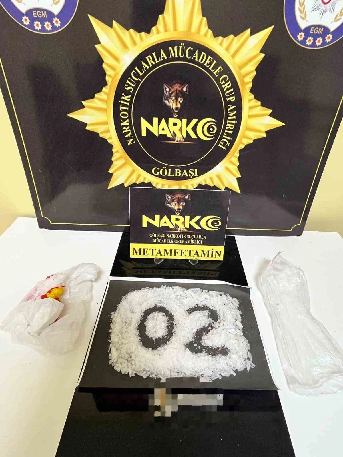 Gölbaşı İlçe Emniyet Müdürlüğü Narkotik Suçlarla Mücadele Büro Amirliğince yapılan saha çalışmalarında uyuşturucu madde sevki yapabileceği şüphesi bulunan bir araç durduruldu. Araç içerisinde zulalanmış şekilde 111,55 gram metamfetamin maddesi ele geçirildi.