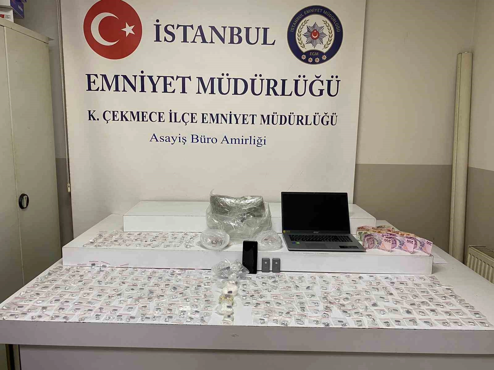 Polis ekipleri, Küçükçekmece Kanarya Mahallesi'nde uyuşturucu madde ticareti yapıldığı ve zula olarak kullanılan bir adresten alınarak sokak satıcıları aracılığıyla satışı yapıldığı yönünde ihbar üzerine harekete geçti. Küçükçekmece İlçe Emniyet Müdürlüğü Asayiş Büro Amirliği ekipleri tarafından 05.10.2023 tarihi saat 13.50 sıralarında gerçekleştirilen operasyonda M.A.A. isimli şüpheli yakalandı. Adreste yapılan aramalarda 392 parça taş/toz hallerdeki 444,6 gram kokain, 775 gram marihuana, 2 adet hassas terazi, 1 adet cep telefonu, 1 adet laptop, bin 165 TL para ele geçirildi. Emniyette işlemleri biten şahıs, 06.10.2023 tarihinde sevk edildiği adli makamlarca tutuklanarak cezaevine gönderildi.
