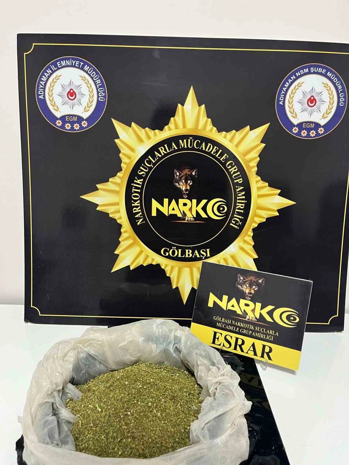 Adıyaman Gölbaşı İlçe Emniyet Müdürlüğü'ne bağlı Narkotik Suçlarla Mücadele Büro Amirliği ekipleri, durumlarından şüphelenerek durdurdukları H.K., S.G. ve Y.K. isimli 3 şahsın üst aramasını yaptı. Yapılan aramalarda 459,15 gram kubar esrar maddesi ele geçirildi. Emniyette işlemleri tamamlanarak Gölbaşı Adliyesine sevk edilen şahıslardan Y.K. ve S.G. isimli şahıslar adli kontrol şartıyla serbest kalırken H.K. isimli şahıs ise tutuklanarak cezaevine gönderildi.