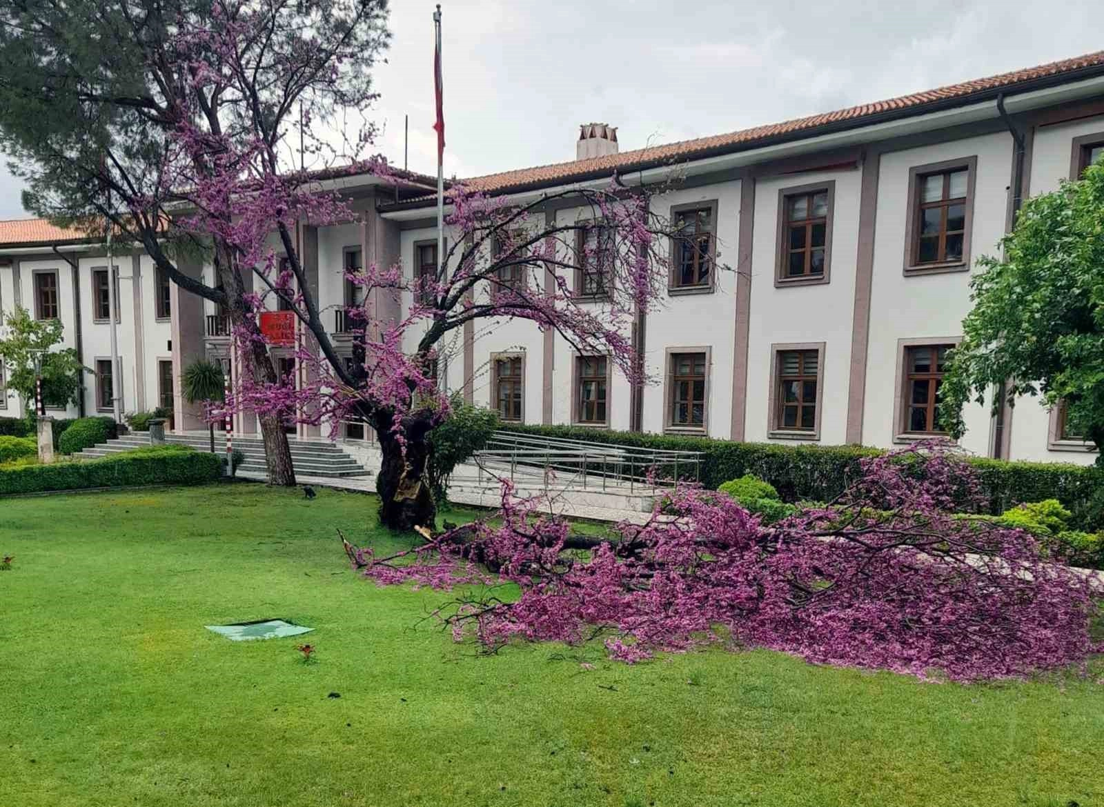 Muğla Valiliği giriş kapısının hemen yanında yıllardır Valiliğe gelenleri karşılayan ve Nisan ayında renk şöleni yaşatan Erguvan ağacının çiçek açmış dallarının bir bölümü fırtına sonrası kırıldı.