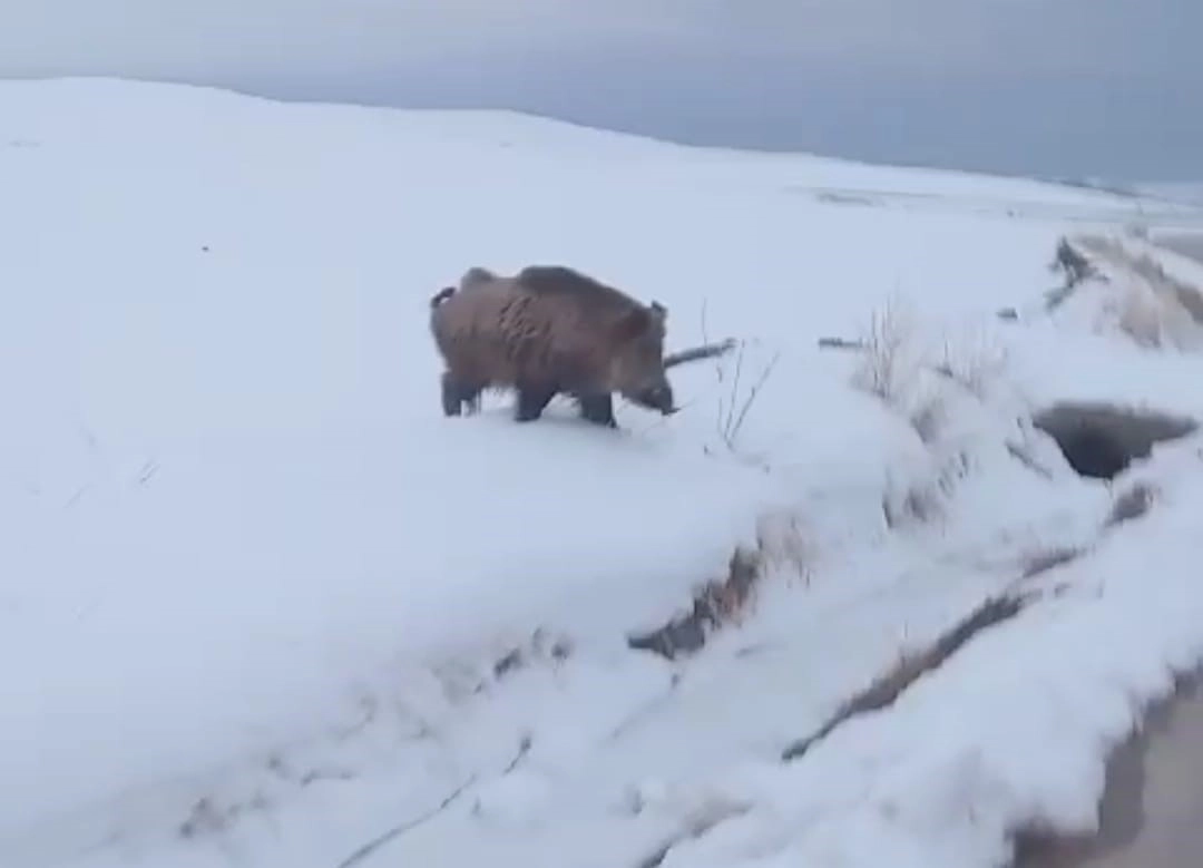 Van'ın Tuşba ilçesinde elektrik arızasına giden ekipler, yolda karşılaştıkları yaban domuzunu cep telefonu kamerasıyla kaydetti.