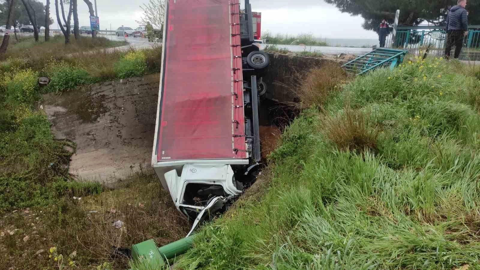 Bursa'nın Orhangazi ilçesinde virajı alamayan kamyon, karşı yönden gelen hafif ticari araca çarptıktan sonra dere yatağına uçtu. Kazada 2 sürücü de sıkıştıkları araçlardan itfaiye yardımıyla çıkarılarak hastaneye kaldırıldı.
