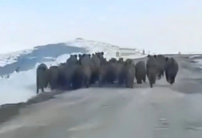 Karlı ve açık bir alanda ilerleyen domuz sürüsü, aniden yola çıkarak aracın önünde koştu. Yaban sürüsü bir sürü aracın önünde koşarak ilerledikten sonra karlı araziye girerek gözden kayboldu.