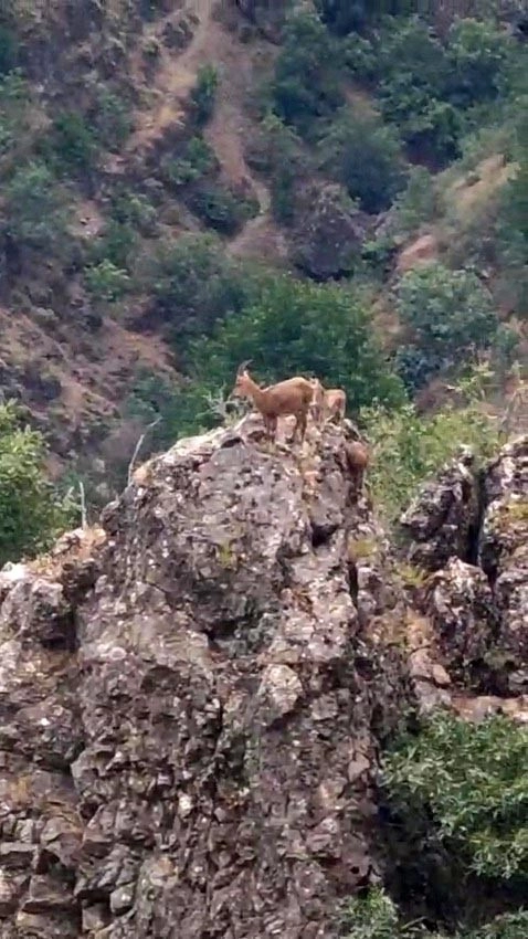 Karabük'te kayalığın üzerindeki yabani keçi ile yavruları cep telefonu kamerası ile görüntülendi.