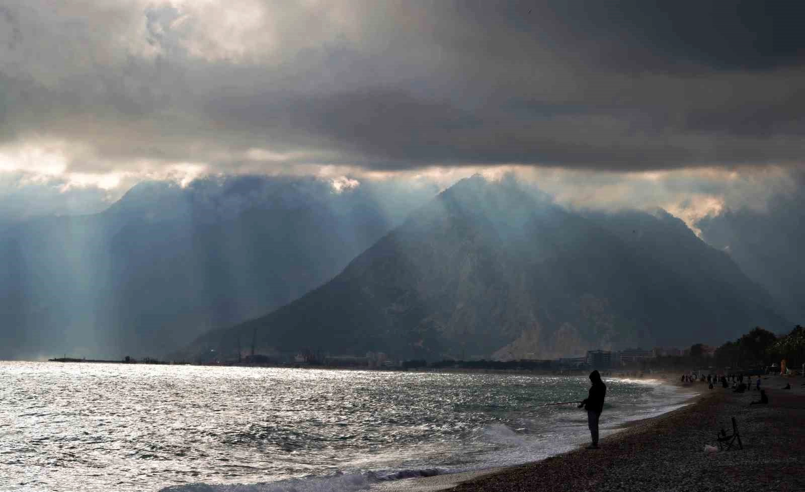Meteoroloji Bölge Müdürlüğü'nün kuvvetli yağış uyarısı yaptığı Antalya'da, yağmur bulutlarının arasından süzülen ışık hüzmesi sonrası muhteşem manzarayı gözler önüne serdi. Hafta sonunu değerlendirmek isteyen vatandaşlar da sahillerde vakit geçirdi.