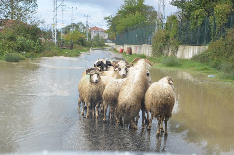 Sinop Akliman Sinop cezaevi yolu sular altında kaldı yolda geçmekte olan koyun sürüleri saatlerce yolda mahsur kaldı kurtarılmayı beklediler.