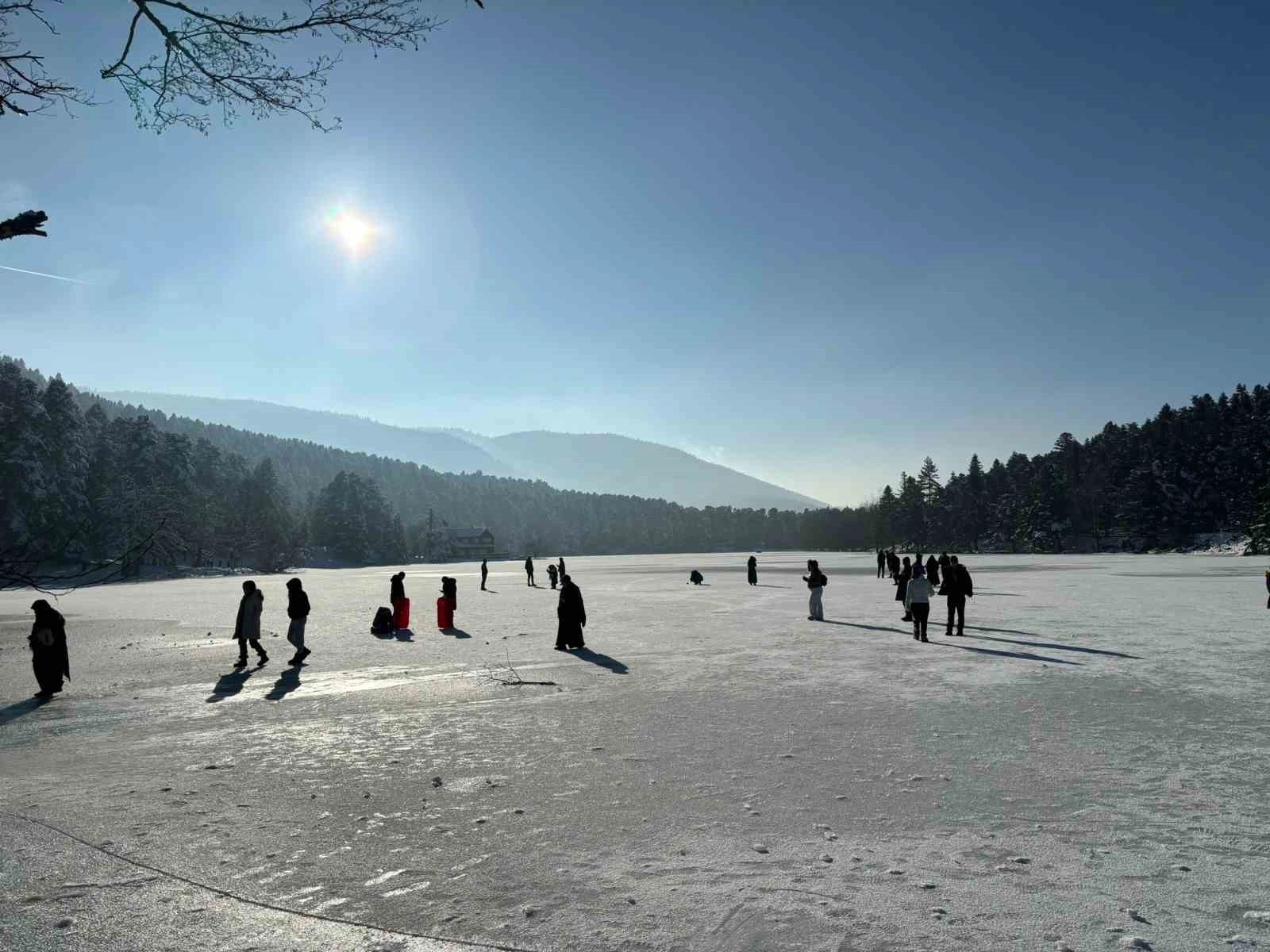 Çevredeki görevliler ise buz tutan gölün üzerinde yürüyenleri düdükle uyararak alandan uzaklaştırdı.