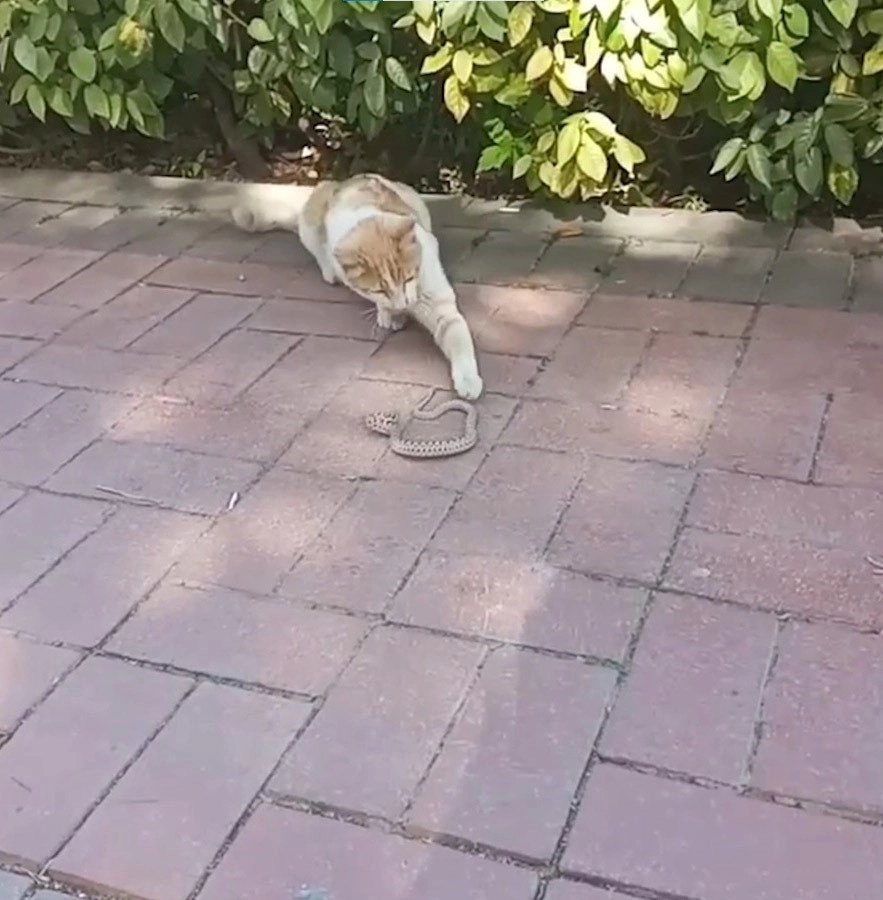 Kırşehir'de yılan ile kedinin kavgası kameraya yansıdı.