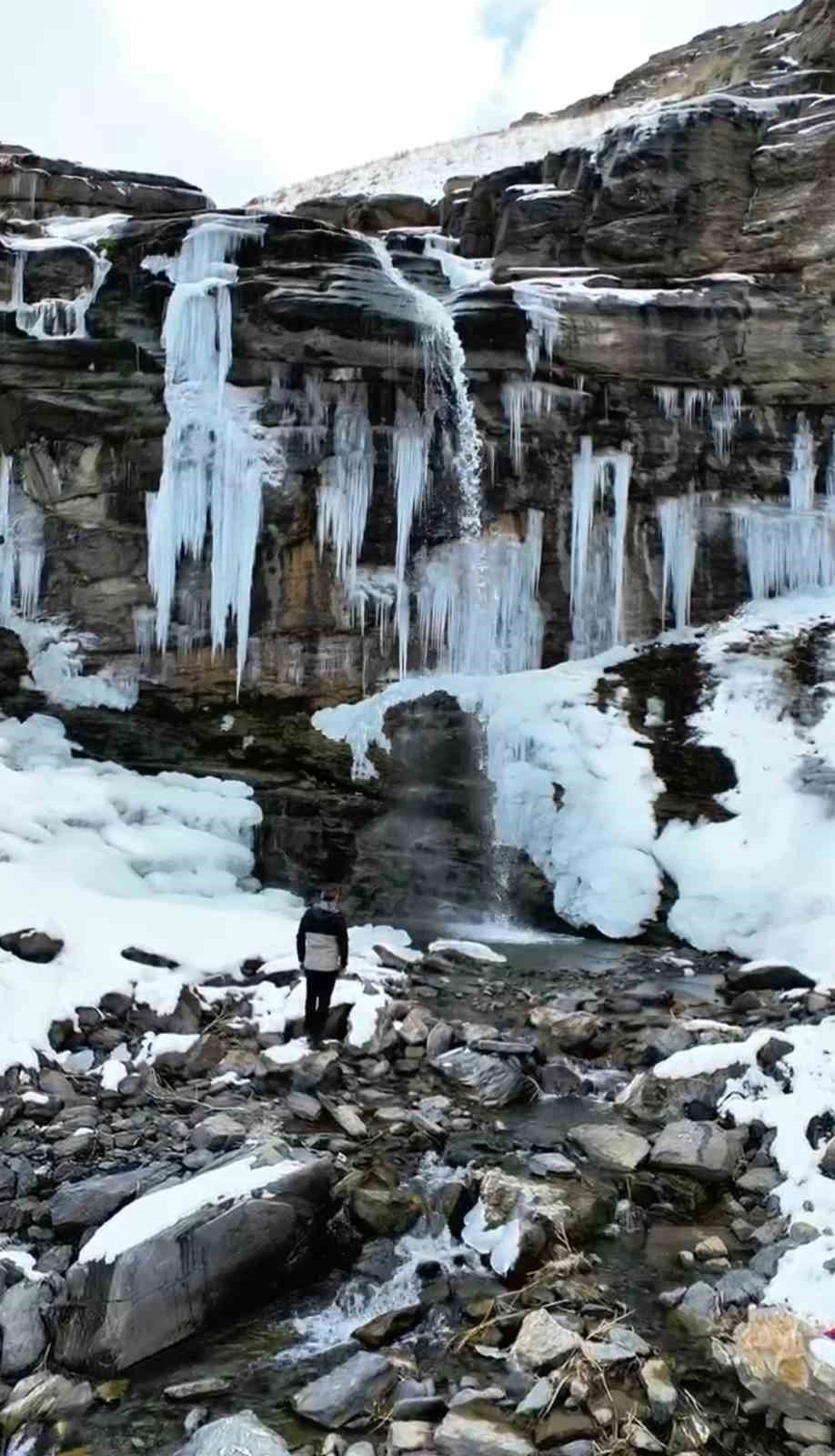 Hakkari'nin Yüksekova ilçesinde soğuk havanın etkisiyle donan şelale hayran bırakırken, oluşan buz sarkıtlarının boyu ise 4 metreyi buldu.