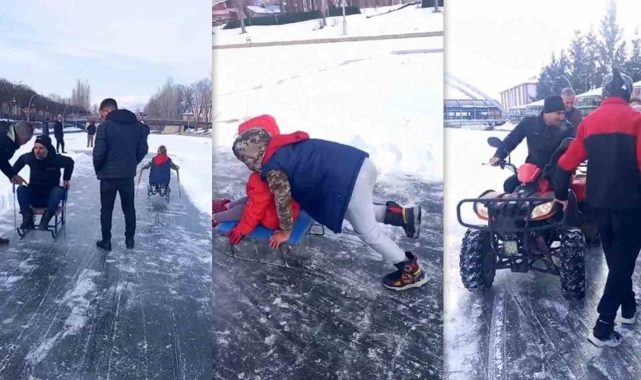 Aşırı soğukların etkili olduğu Bayburt'ta vatandaşlar yüzeyi buz tutan Çoruh Nehrinin üzerinde kızak keyfi yaşadılar.