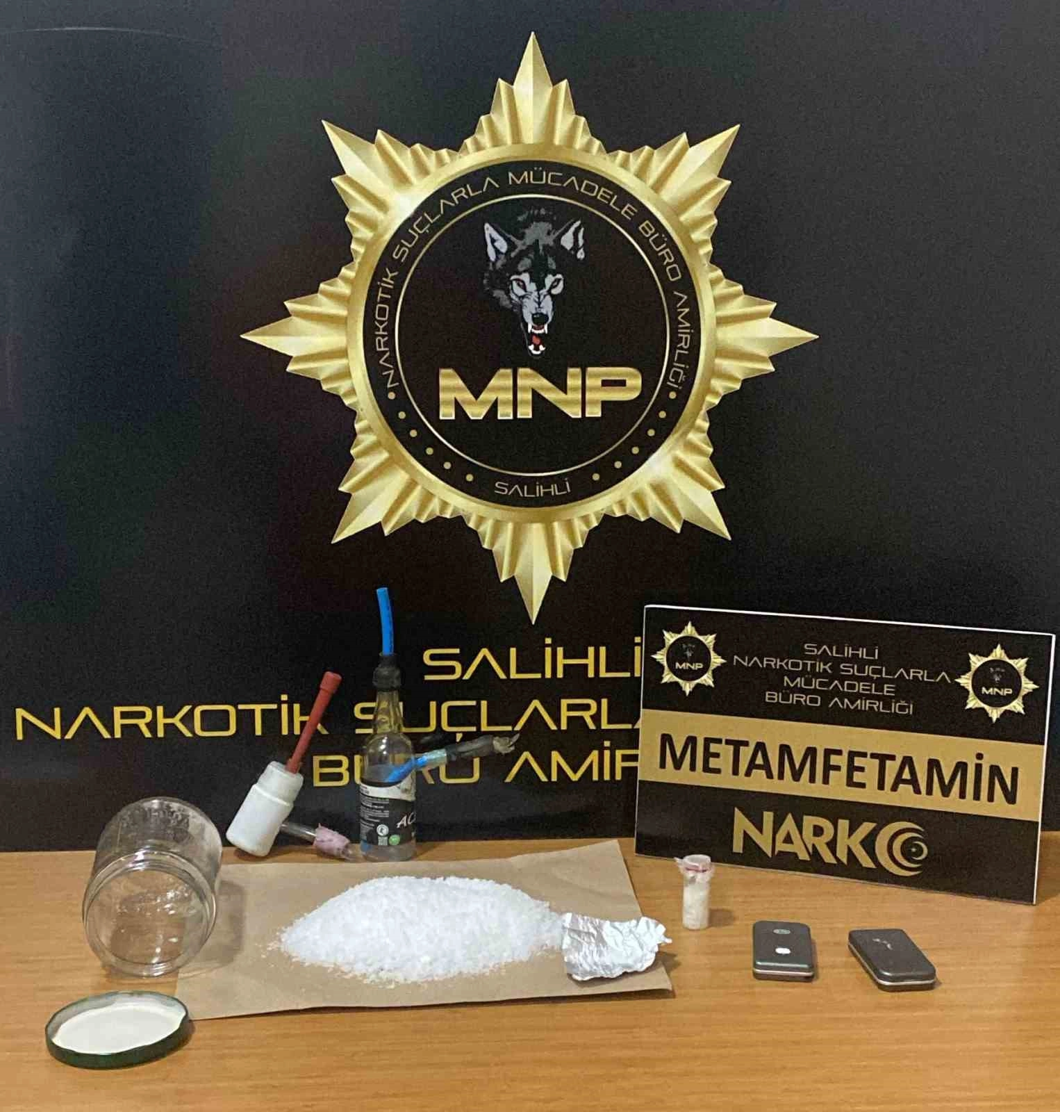 Uyuşturucu veya uyarıcı madde ticareti yapan, nakleden ve kullanan şahıslara yönelik çalışmalarını sürdüren Salihli İlçe Emniyet Müdürlüğüne bağlı Narkotik Suçlarla Mücadele Büro Amirliği ekipleri, S.Ç.(37) isimli bir bayanın ilçeye yüklü miktarda uyuşturucu getirdiği bilgisine ulaştı. Bunun üzerine hareket geçen ekipler, şüpheli S.Ç.'nin Eskicami Mahallesi'ndeki ikametine operasyon düzenledi. Operasyonda 230 gram metamfetamin, 2 hassas terazi ile 2 uyuşturucu kullanma aparatı ele geçirildi. İkamette bulunan şüpheli S.Ç. ile birlikte hareket ettiği tespit edilen F.E.(41) yakalanıp gözaltına alındı.