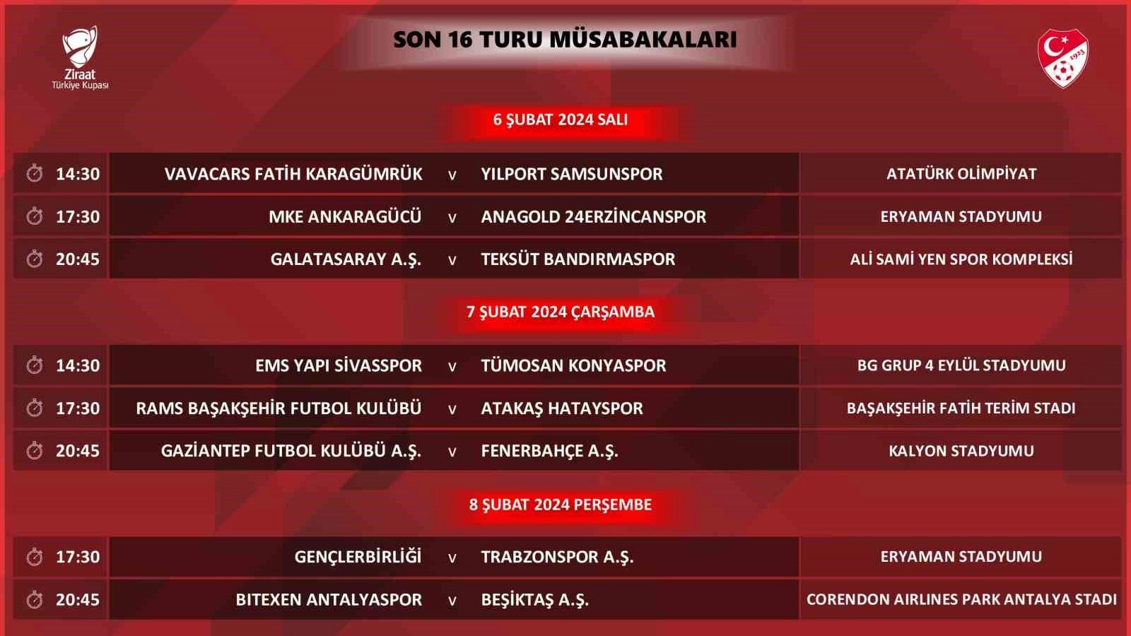Türkiye Futbol Federasyonu, Ziraat Türkiye Kupası Son 16 Turu'nun programını duyurdu. TFF'nin resmi internet sitesinden yapılan açıklamaya göre Türkiye Kupası'nda son 16 turu karşılaşma programı şu şekilde: